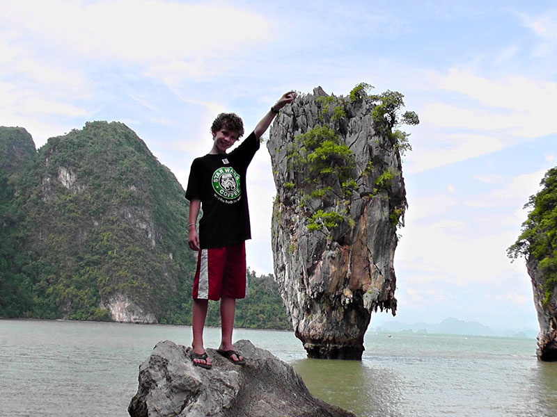 We stop to kayak around a second island before finally heading to James Bond Island (or more specifically, the bigger island right next to it, as James Bond Island is just a tower of rock rising straight up out of the water). There is no pier, so we have to transfer from our boat to the island on a long tail boat. The ride is short and uneventful, but as fate would have it, our British friends step down into the boat in front of us before bending down to take their seats – enough said.