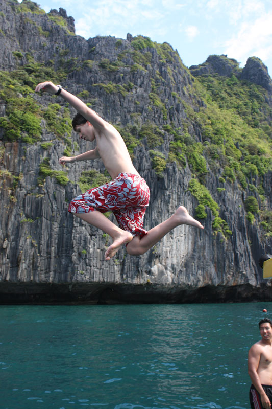 A short swim from the beach, there is a high rock outcropping that a few people are climbing up and jumping off of. They seem to be popping back up with all their limbs intact, so Nick and I head over to give it a try. As with bungee jumping, it has a way of looking much higher looking down that it does looking up, and being the young gentleman that he is, Nick offers to let me go first – he’s so polite.