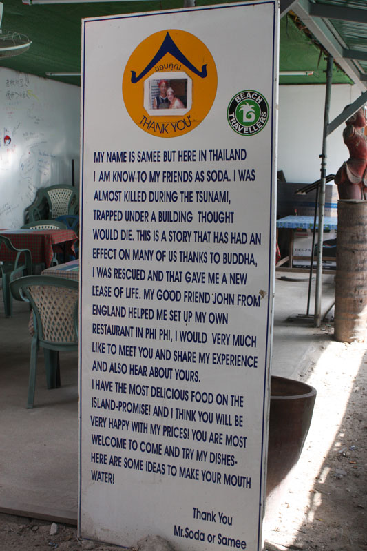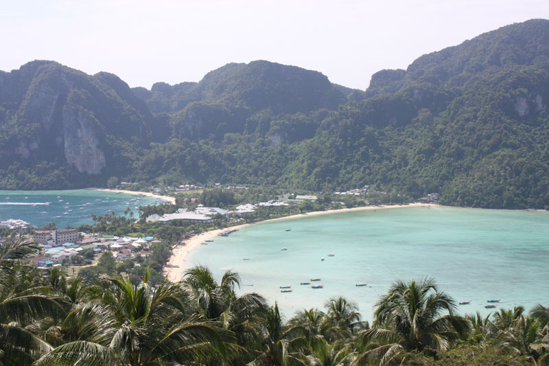 On a previous trip, I stopped in Koh Phi Phi for a few hours on the way to Koh Lanta, and from that brief experience, it seemed like a place to try and stay longer if the opportunity ever presented itself. It’s a fairly small island (two really, but only one is inhabited), with no motorized transportation other than the long tail boats that serve as taxis to some of the more remote parts. Crammed in between two opposing bays with limestone cliffs on either end, sits the town, which was mostly wiped off the map during the tsunami.