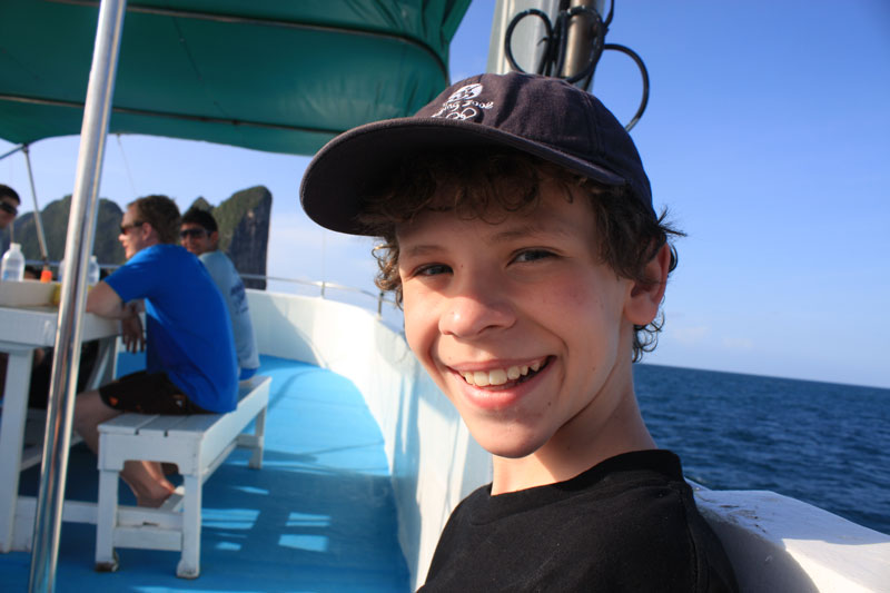 Between dives, we stop for “lunch” (it is only 10:15 in the morning) in Maya Bay, which was the setting for the movie The Beach. I’ve never seen the film, so don’t really know what all the fuss is about, but it is a very popular destination for day trippers, and had we been more organized, I might have tried to take advantage of the overnight camping trips they offer from Koh Phi Phi to spend a little time there without the hordes. Instead, we settle for floating in the bay, snorkeling a bit, and taking turns jumping off the top of the boat.