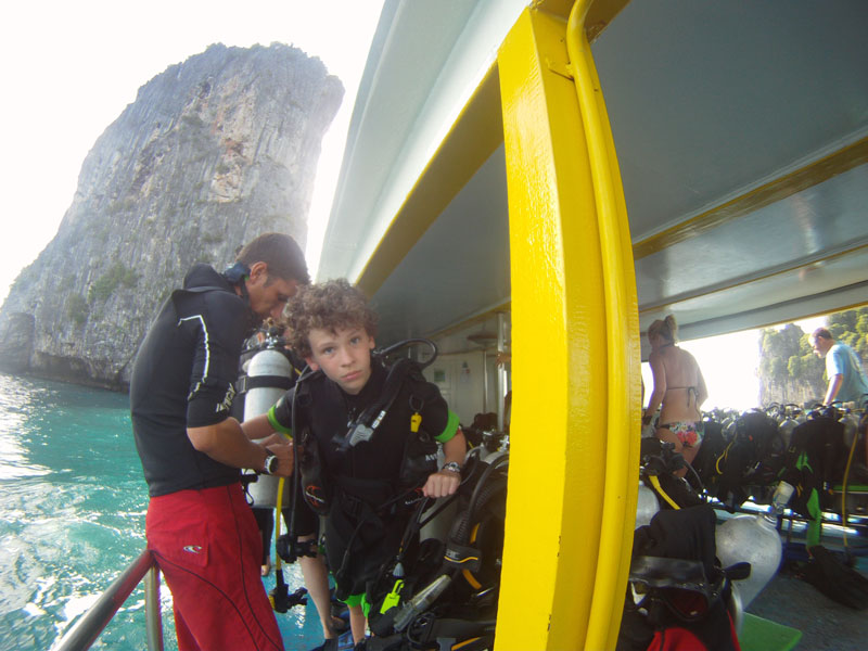 By the time we make it back to Phuket, it is close to 5 in the afternoon, so with the traffic, our return drive takes the better part of two hours. We’re pretty beat by the time they drop us off at the hotel, but scuba diving is next on our agenda, so we rally enough to head back into town to make plans for that. One of the shops we stop at has a dive master from the US who tells us all about the different islands and where he thinks Nick would have a good experience. It turns out he is a former rock climbing bum who spent a good part of his life living in a motorhome at Smith Rock, and when Nick tells him he has climbed there it gets him going on that. Small world.