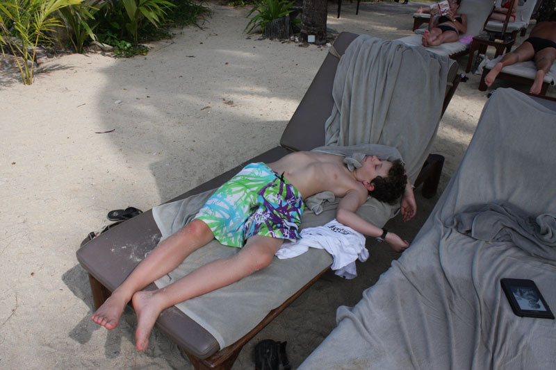 Over the next few days, we manage to do a whole lot of nothing beyond swimming, laying on the beach, and walking down for the occasional massage. Nick plays for hours in the sand, and in the process manages to pick up his first good sunburn. It’s the first time we wonder if he would have more fun if his brothers were with him, but while he misses them, he says he is perfectly happy having the time to himself. I get a jumbo arm bruise from shooting a bow and arrow, but am telling people it is from a bar fight as that sounds less pathetic.