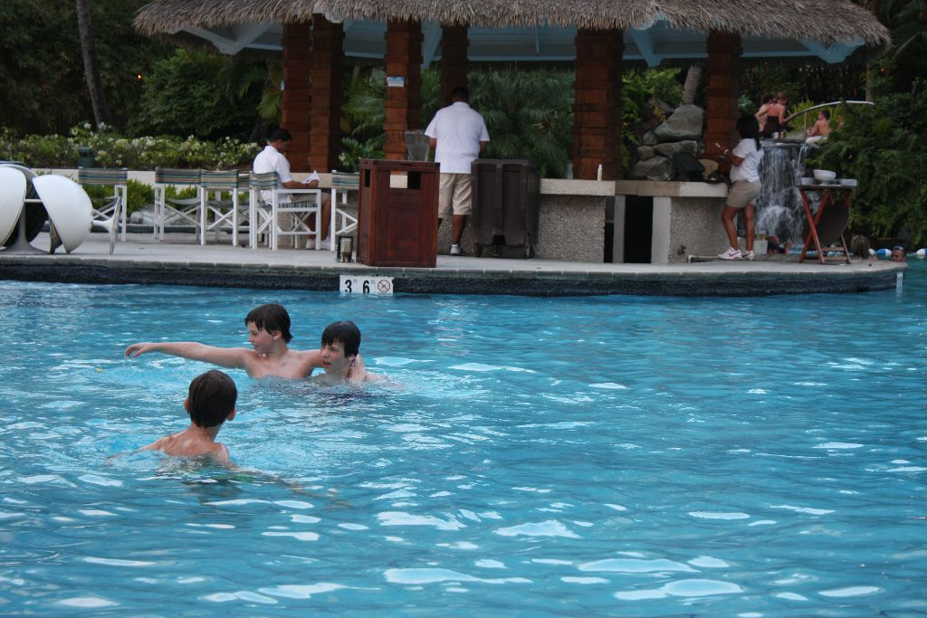 After a couple of active days, we decide to relax a bit and play this one close to home. There must be a fresh load of tourists in, as even though I am at the pool by 7:30, most of the best squats are gone (or, more accurately, marked with stuff, as it’s pretty much just me and the pool boy). I manage to find a space around one of the smaller pools and get a few hours of Kindle time in before the boys finally show up. They aren’t down long though before the skies open up and it starts to pour.