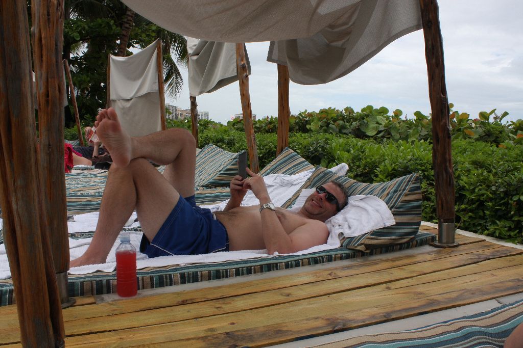It’s a beach day today, and having been through the drill before at resorts like this, I know enough to get down early or risk getting stuck with deck chairs either by the men’s room or the kiddie pool (or both). I have a little too much conscience than to get up early, dump some crap on a chair and then go back to bed, but even at 7:30 am, people (who will ultimately not stroll down again until noon) have marked their territory.