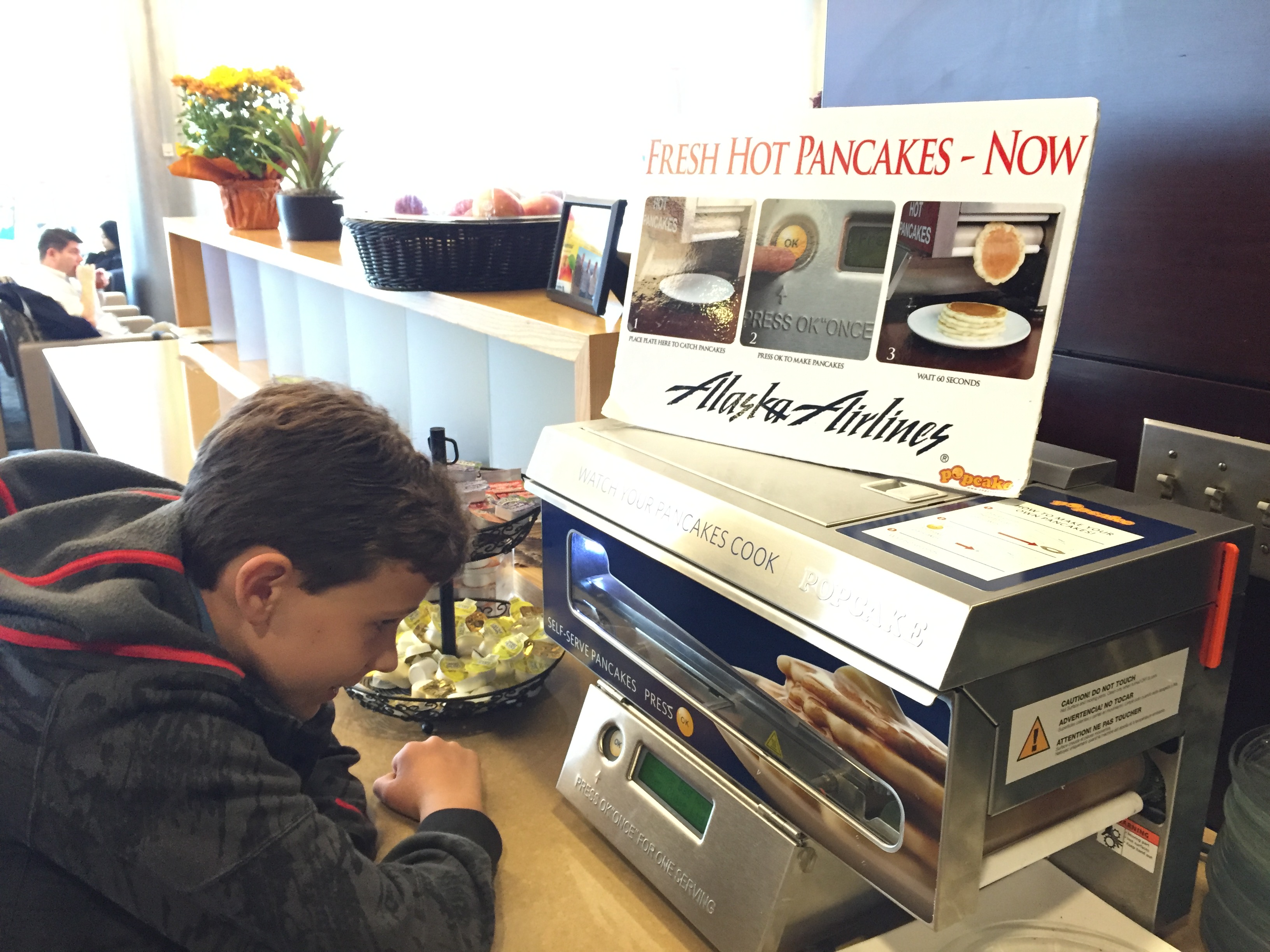 For Joey, the whole experience at the front of the plane is mind blowing. He has never seen anything like it, and the entire time we are boarding and waiting to take off, he taking everything in with eyes as big as saucers. The big seat that turns into a bed? “Awesome.” The big TV? “Awesome.” Personal snack basket and drink cooler? “Awesome.” The remote that controls everything? You guessed it – “Awesome.”