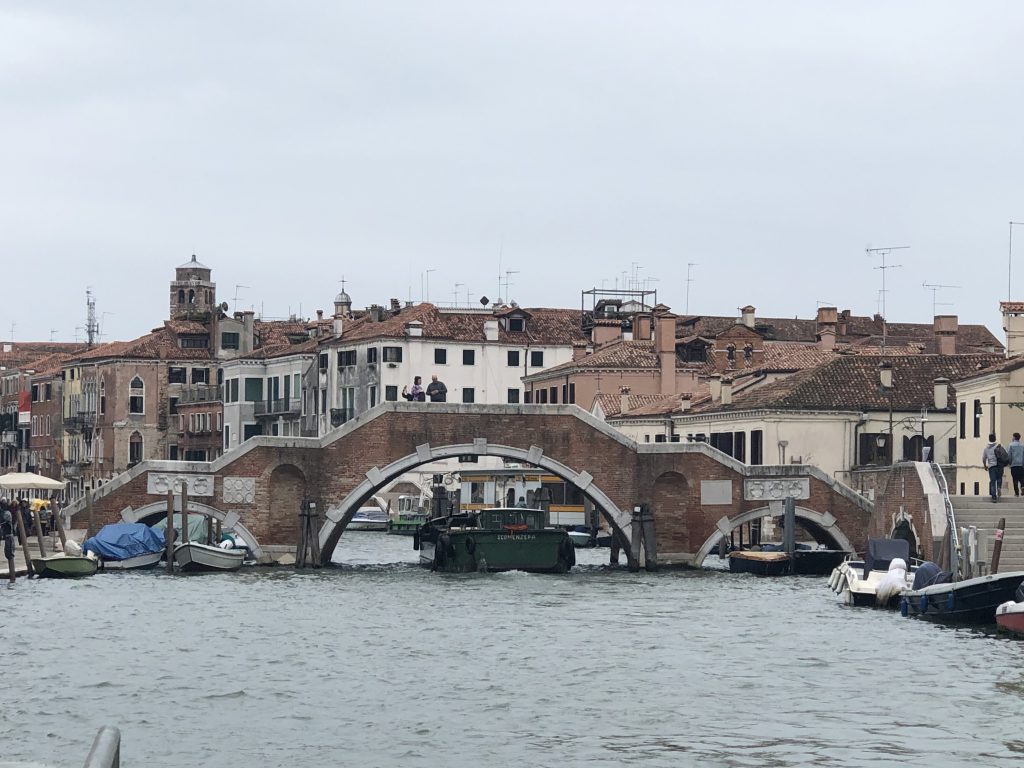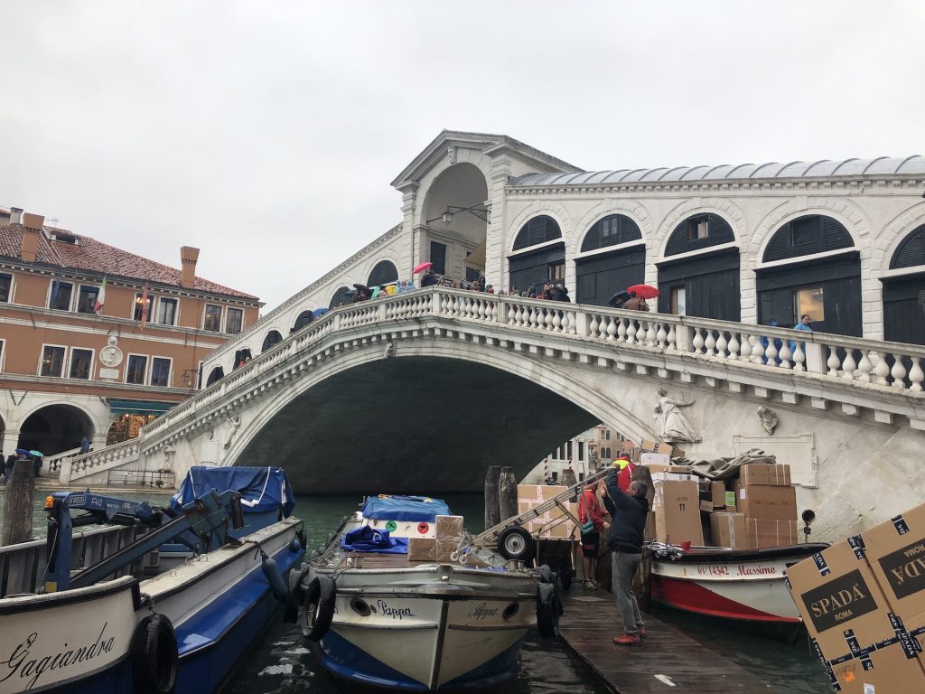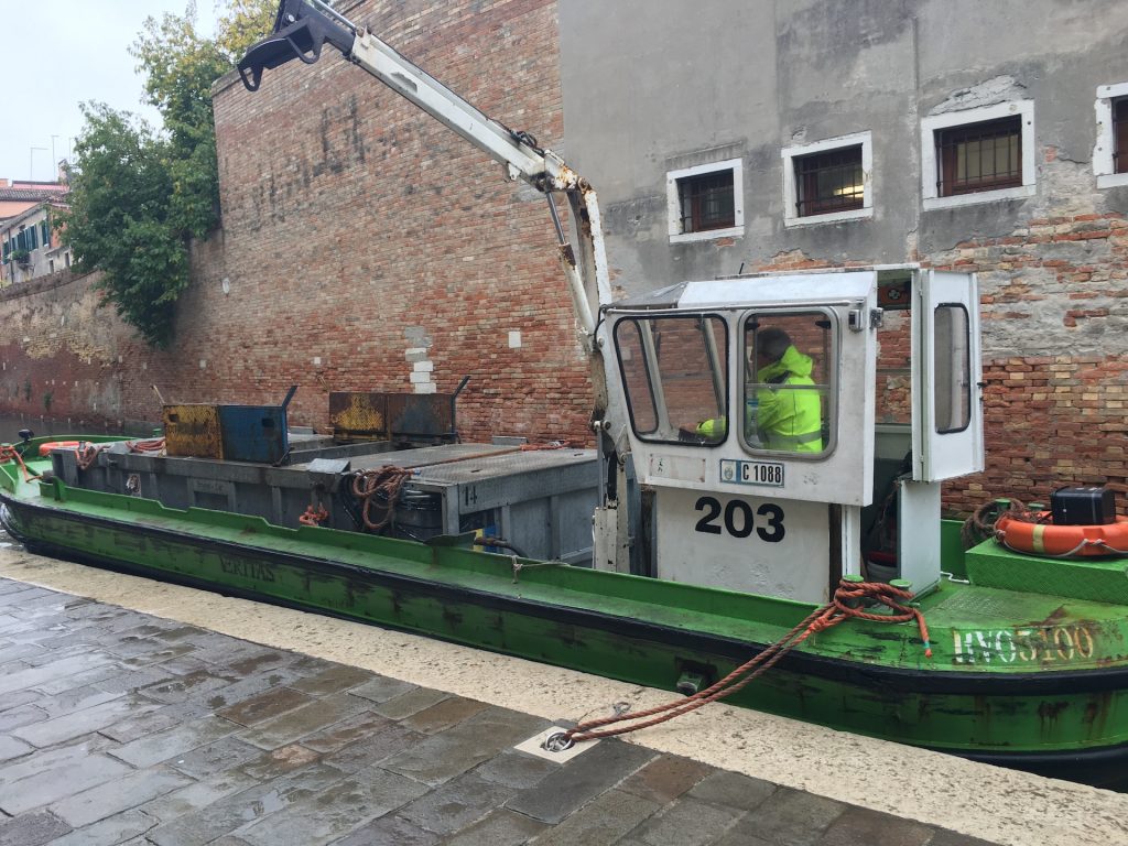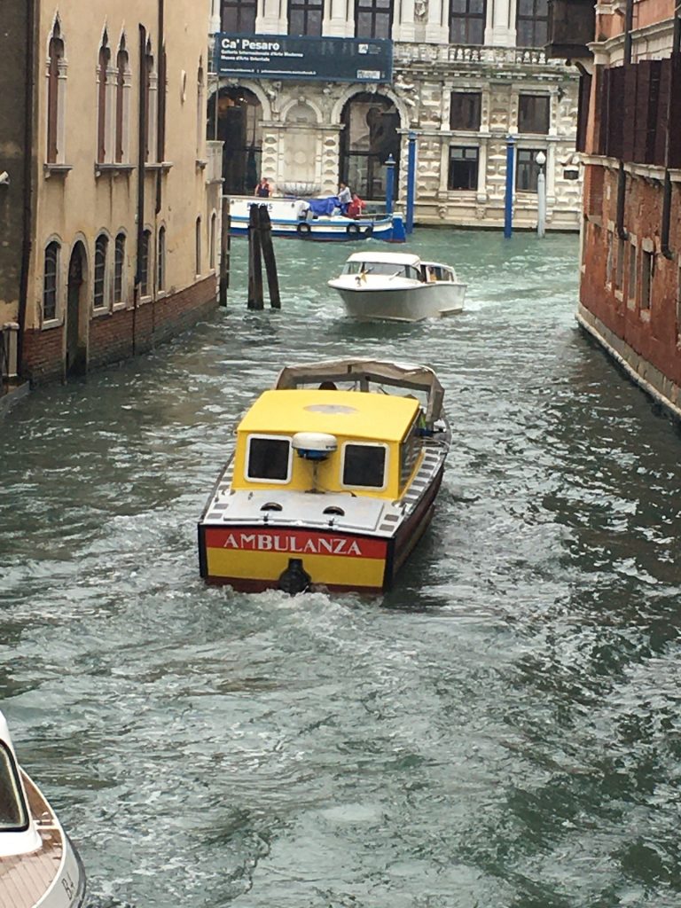 It is a cold, overcast day today although, fingers crossed, no rain. We head back towards the center of town, this time on foot, stopping here and there to observe how everyday activities happen in a city without roads. Take, for example, a Venetian garbage “truck”, or a Venetian ambulance.