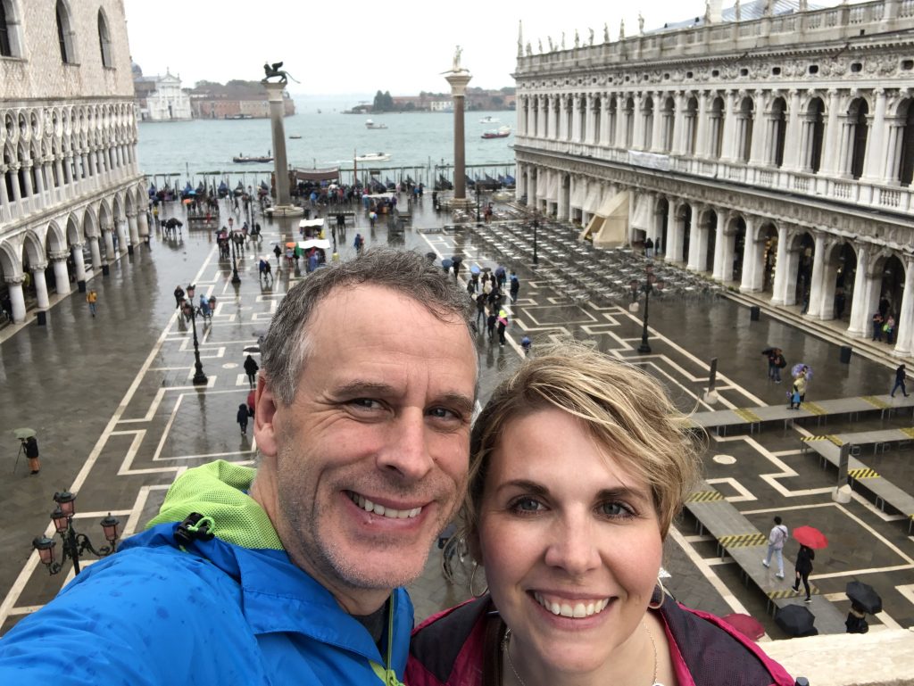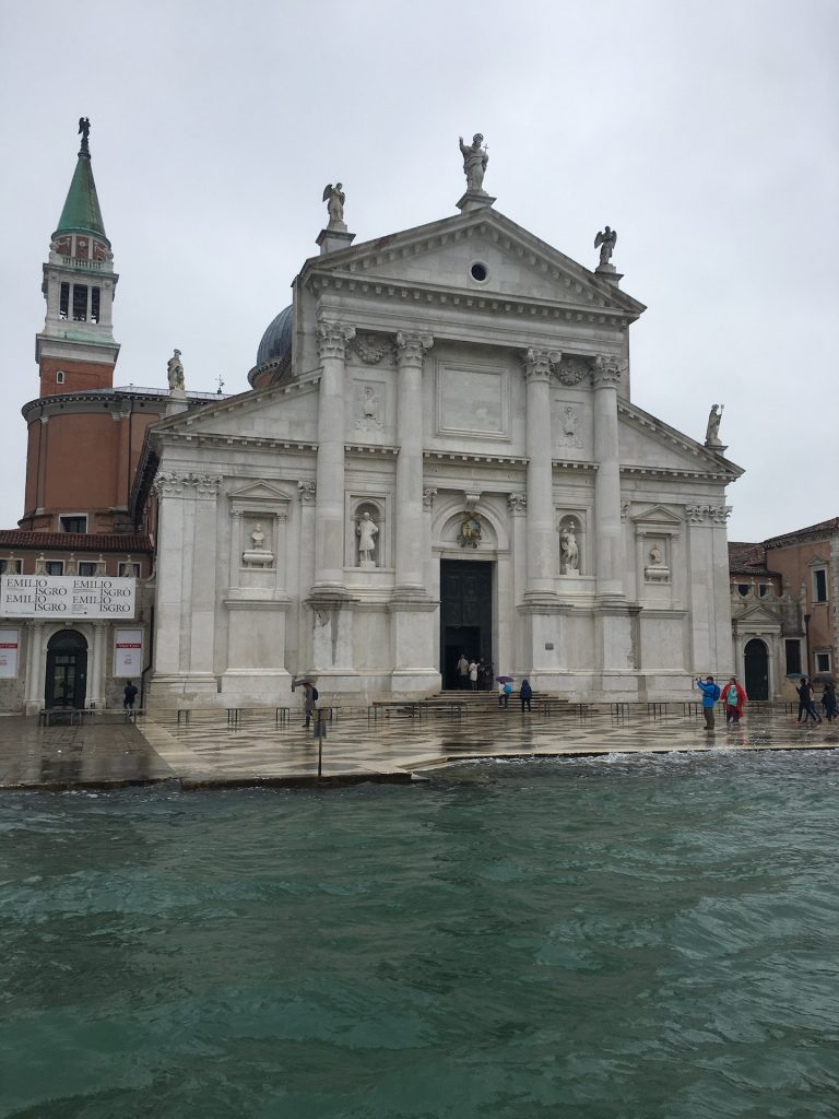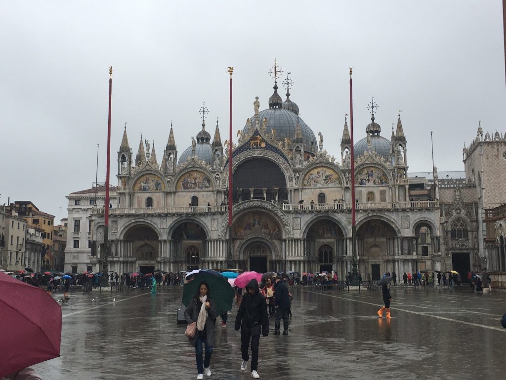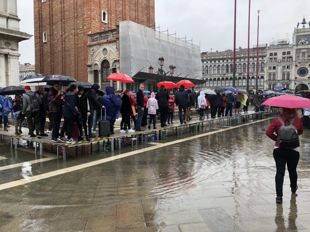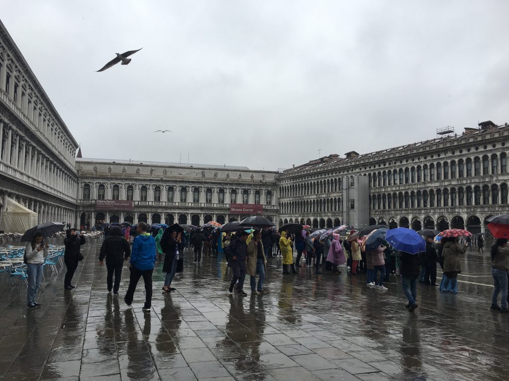 One of the main issues they are dealing with these days is flooding. Venice is in a tidal zone, and between centuries of slowly settling into the mud and rising sea levels, low lying parts of the city end up underwater more than 100 days a year. Today is one of those days and St. Mark’s Square is one of those places. The rain has also arrived. Ugh.