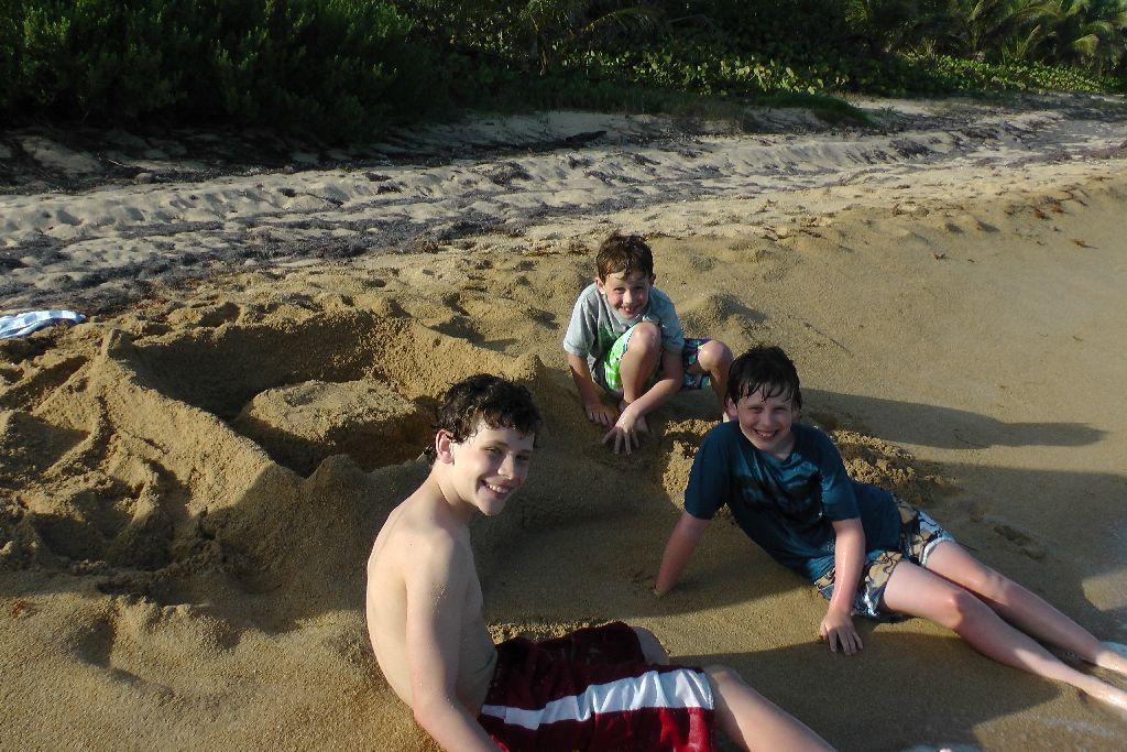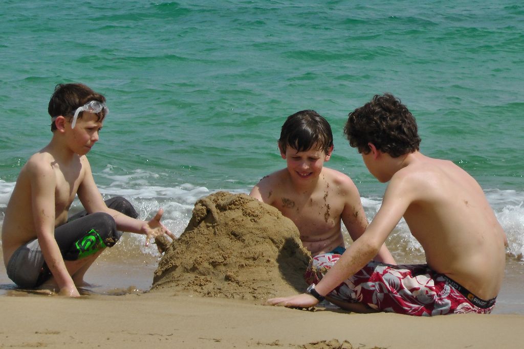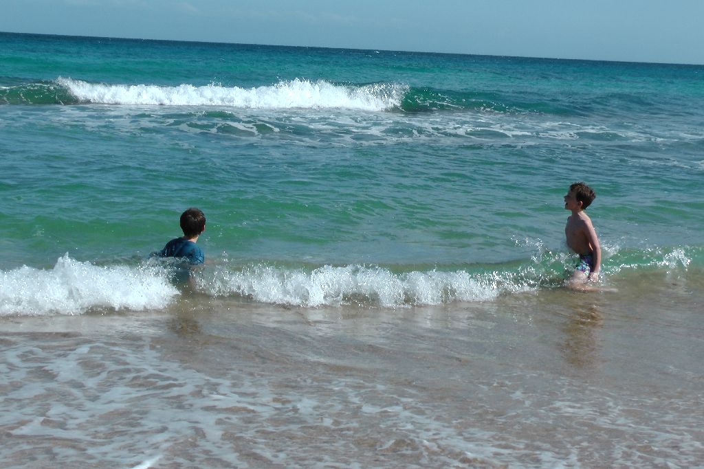 Gas problem solved, we continue on our quest for Black Beach. It’s fairly prominently marked on the map, but we can’t find anything other than a faded sign nailed to a tree, so we decide to head on a bit further to Long Beach. It’s much more deserted than Red Beach and the water rougher, but the waves give the boys something new to do and they spend a good hour or so honing their body surfing skills.